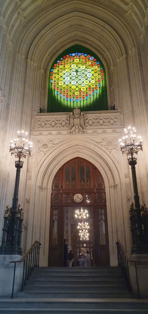Moving on from St Stephen’s we were guided by our headphones through the many corridors, lobbies, meeting and debating rooms, all lavishly and opulently decorated. The House of Lords with a red theme, House of Commons with a green theme, carpets that made you want to take your shoes off and sink your toes into them. Gold and gilt decoration, artefacts, paintings, furniture, scriptures all recording centuries of our British history. It certainly was an eye opening tour but unfortunately with a no photography rule of the areas after St Stephen’s Chapel.